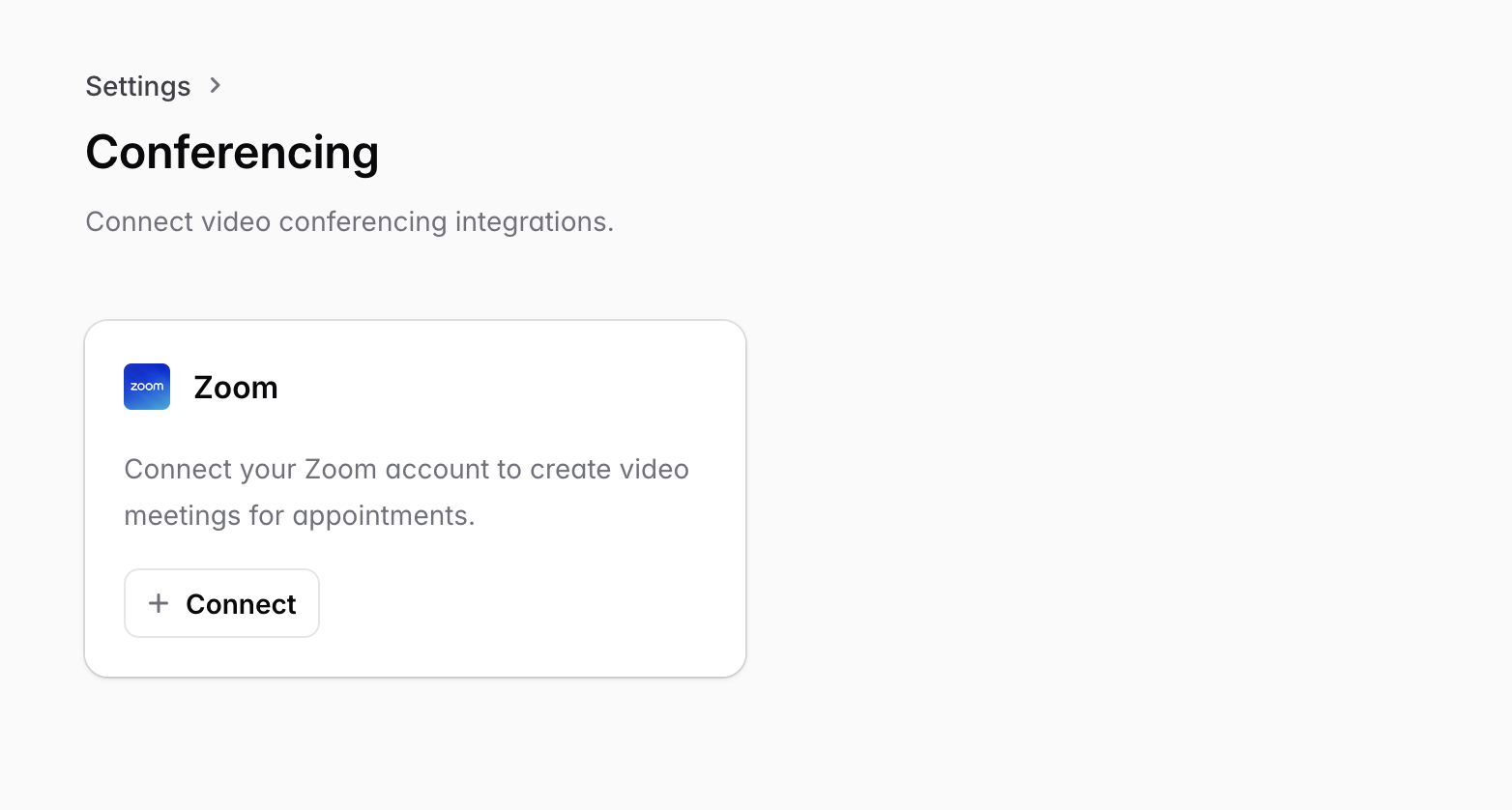 To connect your Zoom account to SavvyCal, click Settings > Conferencing. Then, click Connect on the Zoom app: