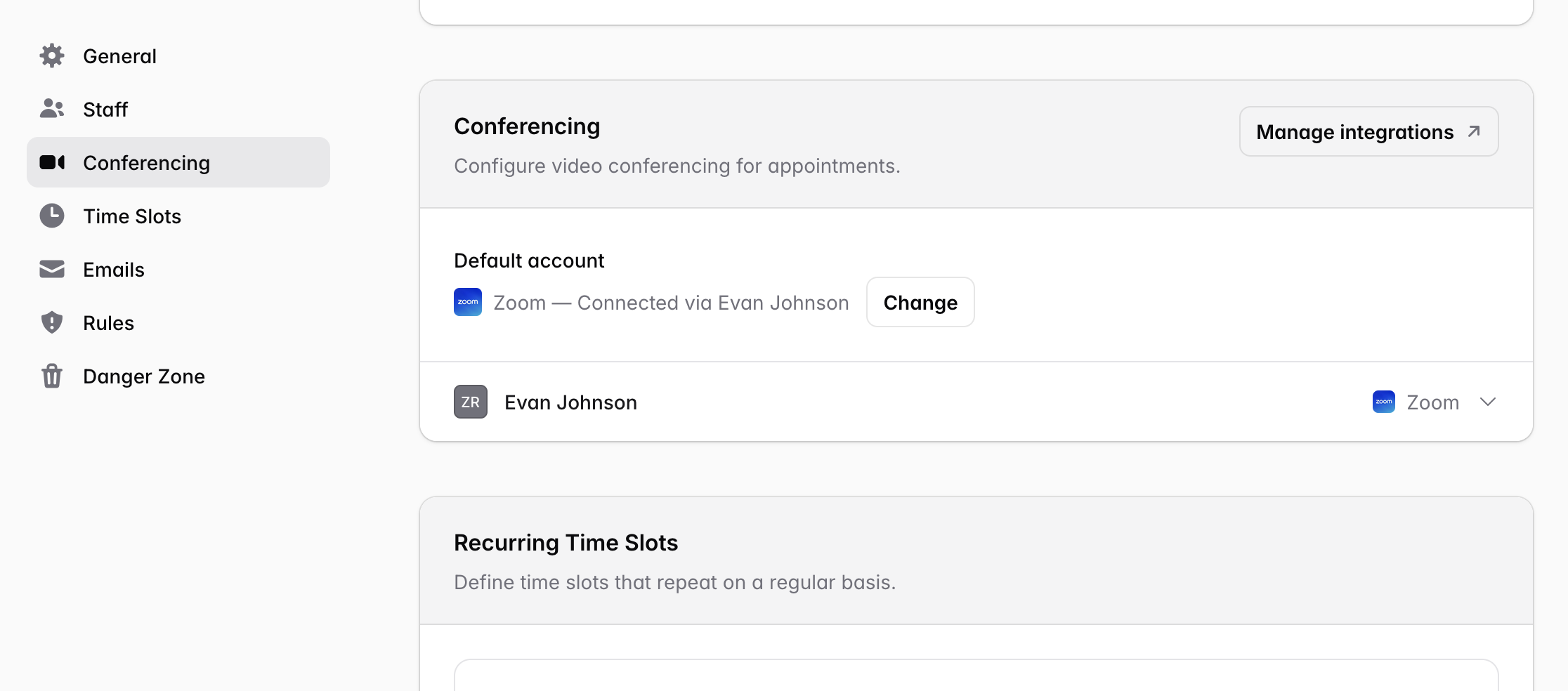 Once you've connected your Zoom account, you can choose it as the conferencing provider when editing the settings on a Service.